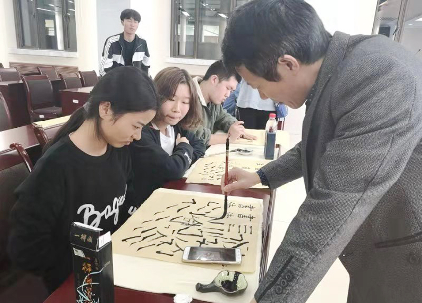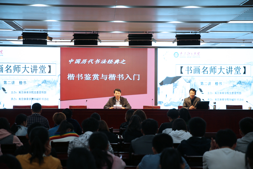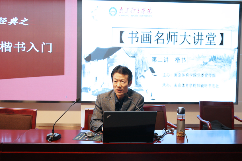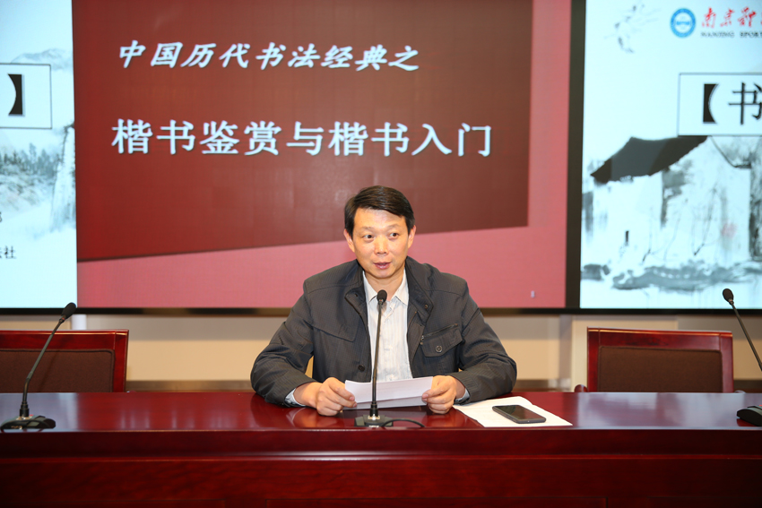 集体学习结束后,现场举行了由校党委宣传部主办、钟毓轩书法社承办的书画名师大讲堂系列活动第二期。书法家端木利银先生应邀作书法知识讲座,重点介绍了楷书鉴赏与入门知识,并现场耐心指导同学们练习书法。