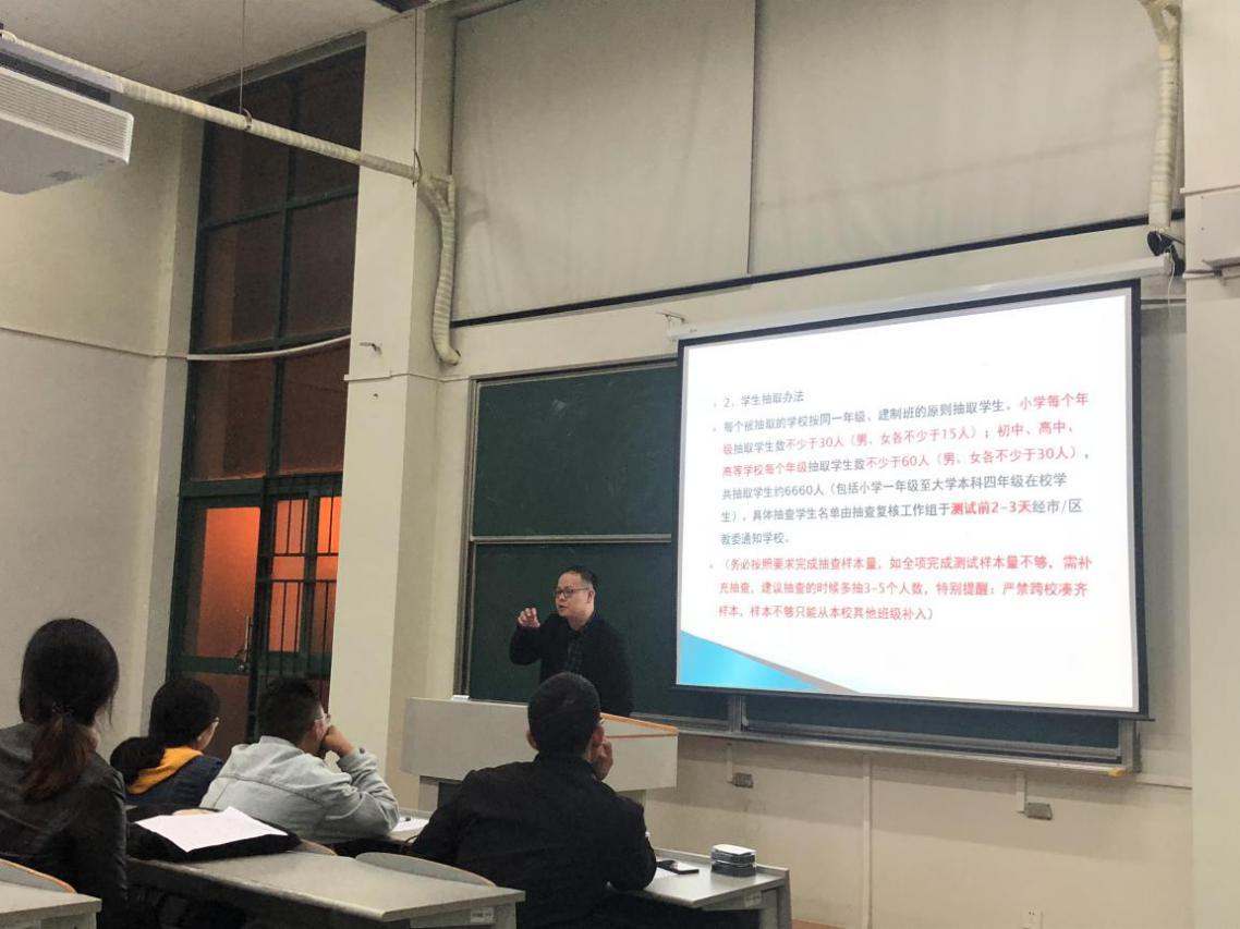 运动健康科学系实验室副主任孙强老师,就抽查复核工作进行了再培训。培训从工作前期准备到现场测试工作流程再到最后的数据上传,都作了全面详细的讲解,对各位老师、研究生的疑惑进行回答,为此次测试抽查复核、问卷调查和学生视力健康状况抽查工作做足一切准备。