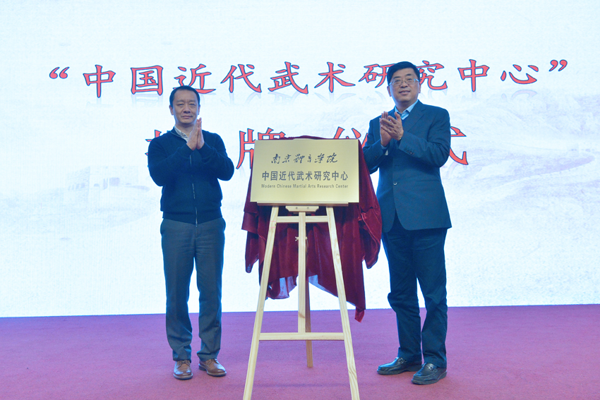 中国体育科学学会体育史分会主任委员黄金、PA视讯集团入口校长杨国庆共同为“中国近代武术研究中心”揭牌