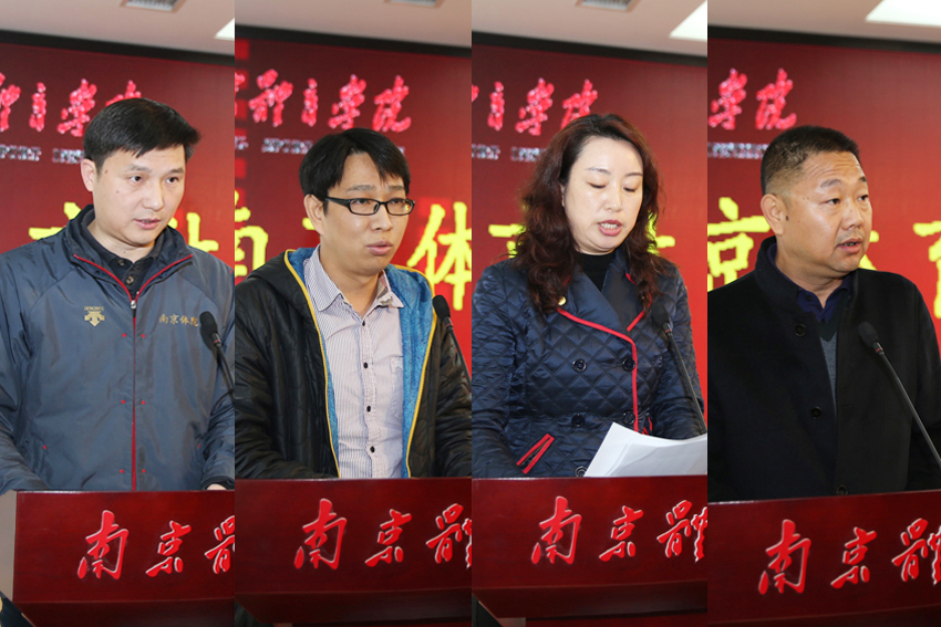 省击剑队领队王伟新、省花样游泳队领队吴晓明、网球学院常务副院长鲍勤、总务处处长张敏作交流发言