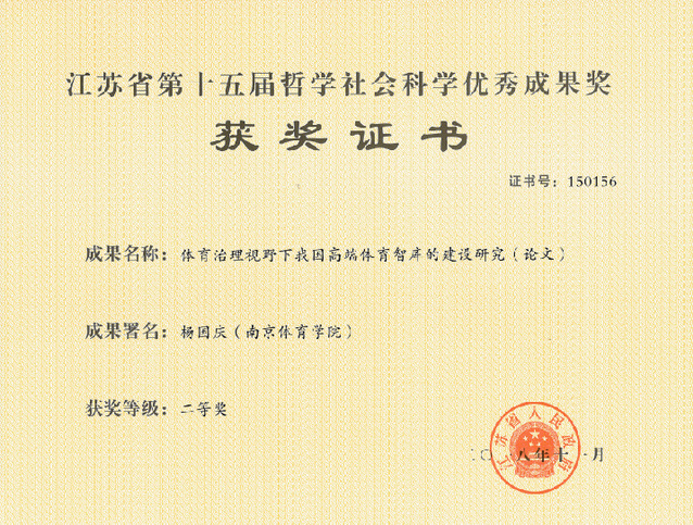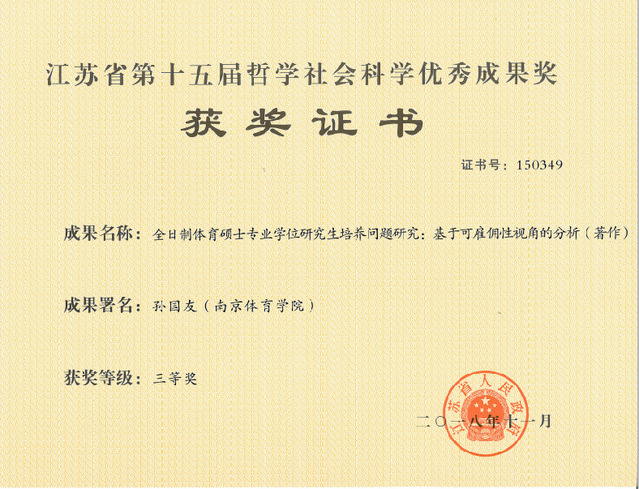 PA视讯杨国庆校长论文《体育治理视野下我国高端体育智库的建设研究》荣获二等奖,孙国友专著《全日制体育硕士专业学位研究生培养问题研究:基于可雇佣性视角的分析》荣获三等奖。2018年全省体育学学科共有10项成果江苏省第十五届哲学社会科学优秀成果奖,其中,一等奖1项、二等奖3项、三等奖5项。