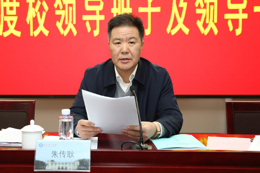 校党委书记朱传耿主持大会,代表校党委作校领导班子述职述廉报告并作个人述职述廉报告
