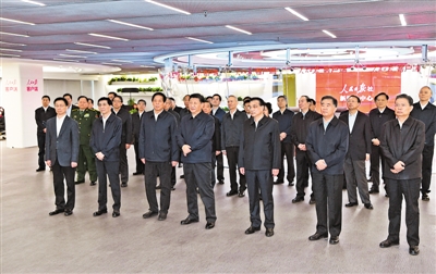 1月25日,中共中央政治局在人民日报社就全媒体时代和媒体融合发展举行第十二次集体学习。这是习近平、李克强、栗战书、汪洋、王沪宁、赵乐际、韩正等在人民日报新媒体中心听取报社微博、微信公众号、客户端建设情况汇报,并观看新媒体产品展示。