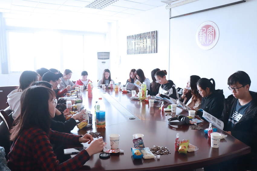 参观完校园后,校记者团成员来到南京财经大学新闻学院的会议室。南财长江记者团的同学们非常热心地为大家准备了零食和饮料。落座后,双方分别进行自我介绍。南财长江记者团的同学还阅读了校记者团的宣传画册。之后,两位团长分别介绍了一下各自记者团的成立历史、部门构成以及职能分配情况。双方进行了一定程度上的关于专业、前景的互动交流。