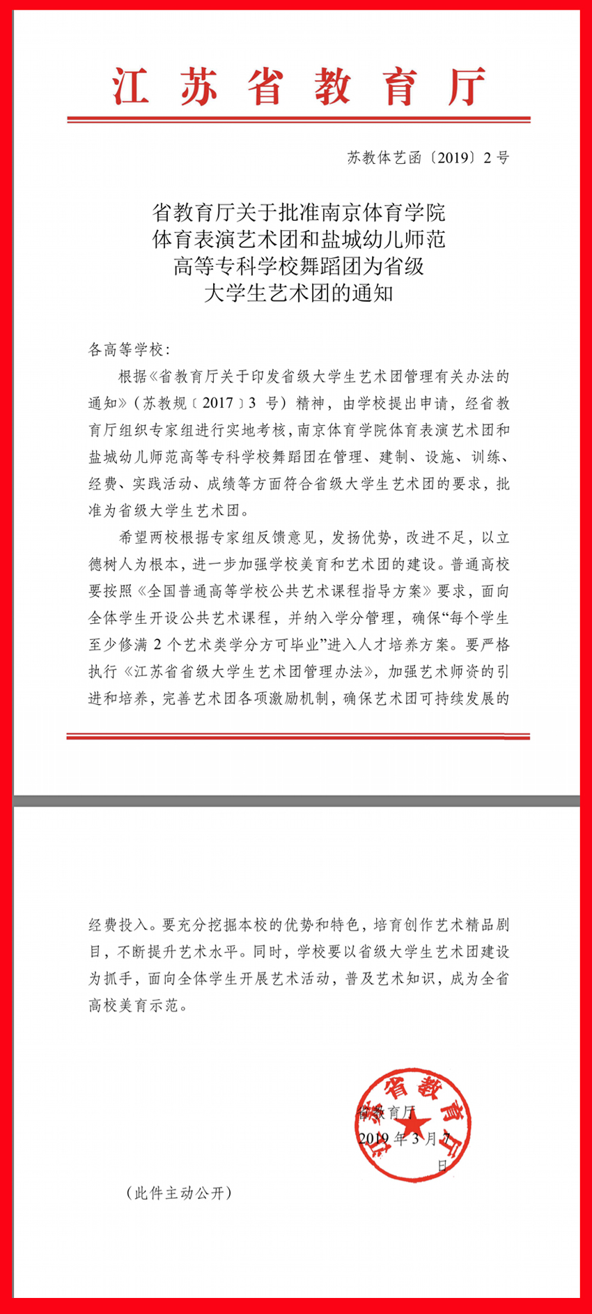 近日,江苏省教育厅下达了《省教育厅关于批准PA视讯集团入口体育表演艺术团和盐城幼儿师范高等专科学校舞蹈团为省级大学生艺术团的通知》(苏教体艺〔2019〕2号),PA视讯体育表演艺术团正式获批江苏省级大学生艺术团。