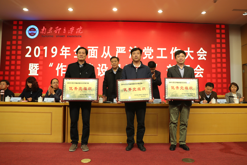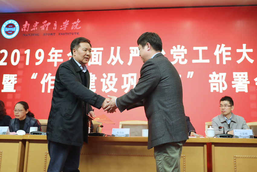 校党委副书记兰亚明宣读了《关于2018年党风廉政建设责任制考核情况的通报》:经校党委常委会研究,确定机关党总支部、民族体育与表演系党总支部、运动系党总支部为2018年度党风廉政建设责任制考核“优秀党组织”。朱传耿、杨国庆、史国生为三个获奖党总支颁奖。