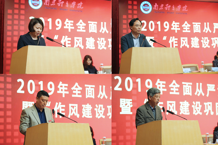 机关第三党总支部书记、信息中心主任、图书馆馆长葛见珠,体育教育与人文学院党总支部书记邹国忠,乒羽学院直属党支部书记、院长张健,后勤党总支部书记顾道代表二级党组织作表态发言。