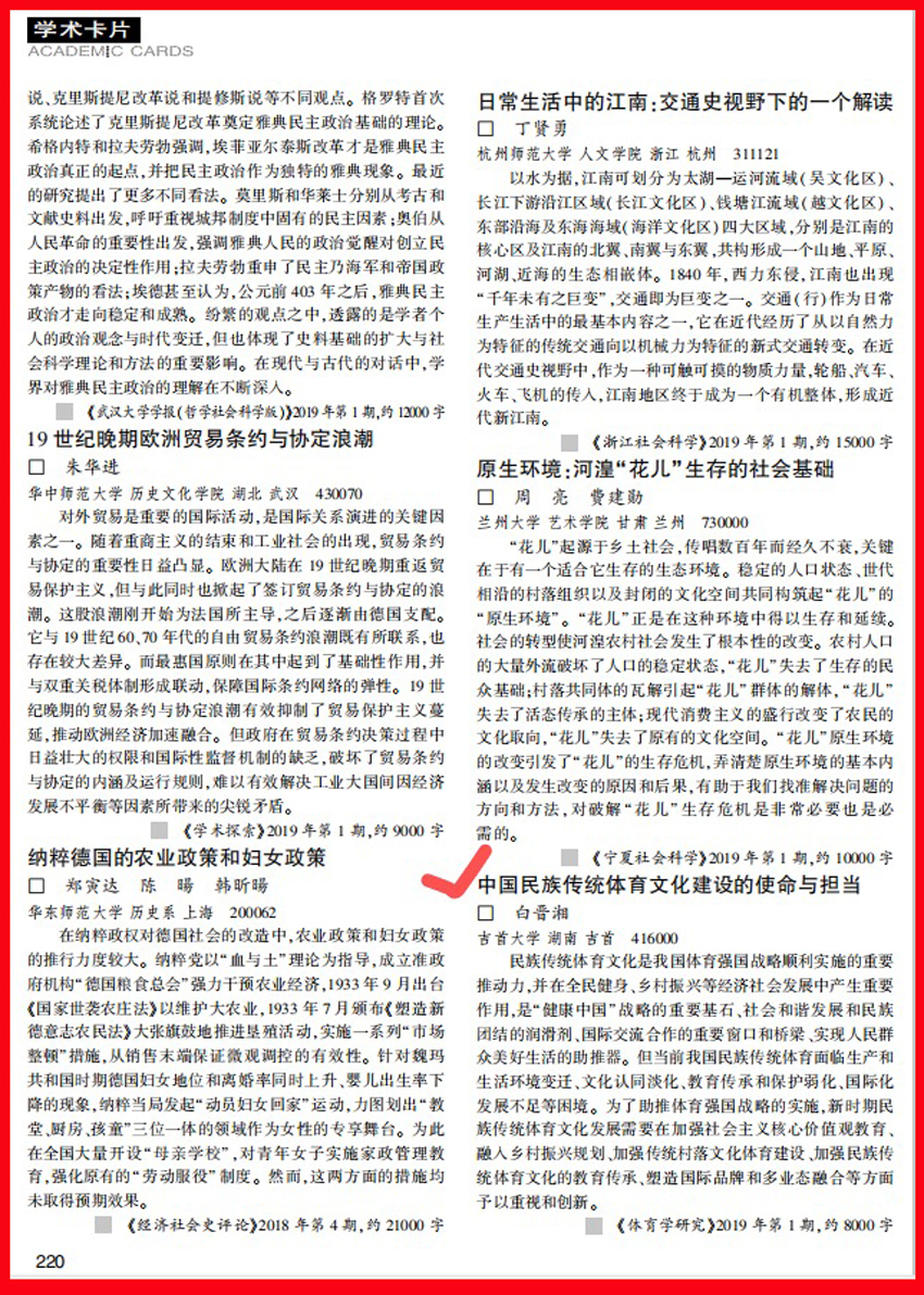 《中国民族传统体育文化建设的使命与担当》学术论点:民族传统体育文化是我国体育强国战略顺利实施的重要推动力,并在全民健身、乡村振兴等经济社会发展中产生重要作用,是“健康中国”战略的重要基石、社会和谐发展和民族团结的润滑剂、国际交流合作的重要窗口和桥梁、实现人民群众美好生活的助推器。 但当前我国民族传统体育面临生产和生活环境变迁、文化认同淡化、教育传承和保护弱化、国际化发展不足等困境。 为了助推体育强国战略的实施,新时期民族传统体育文化发展需要在加强社会主义核心价值观教育、融入乡村振兴规划、加强传统村落文化体育建设、加强民族传统体育文化的教育传承、塑造国际品牌和多业态融合等方面予以重视和创新。(《体育学研究》2019 年第1 期,约8000字)