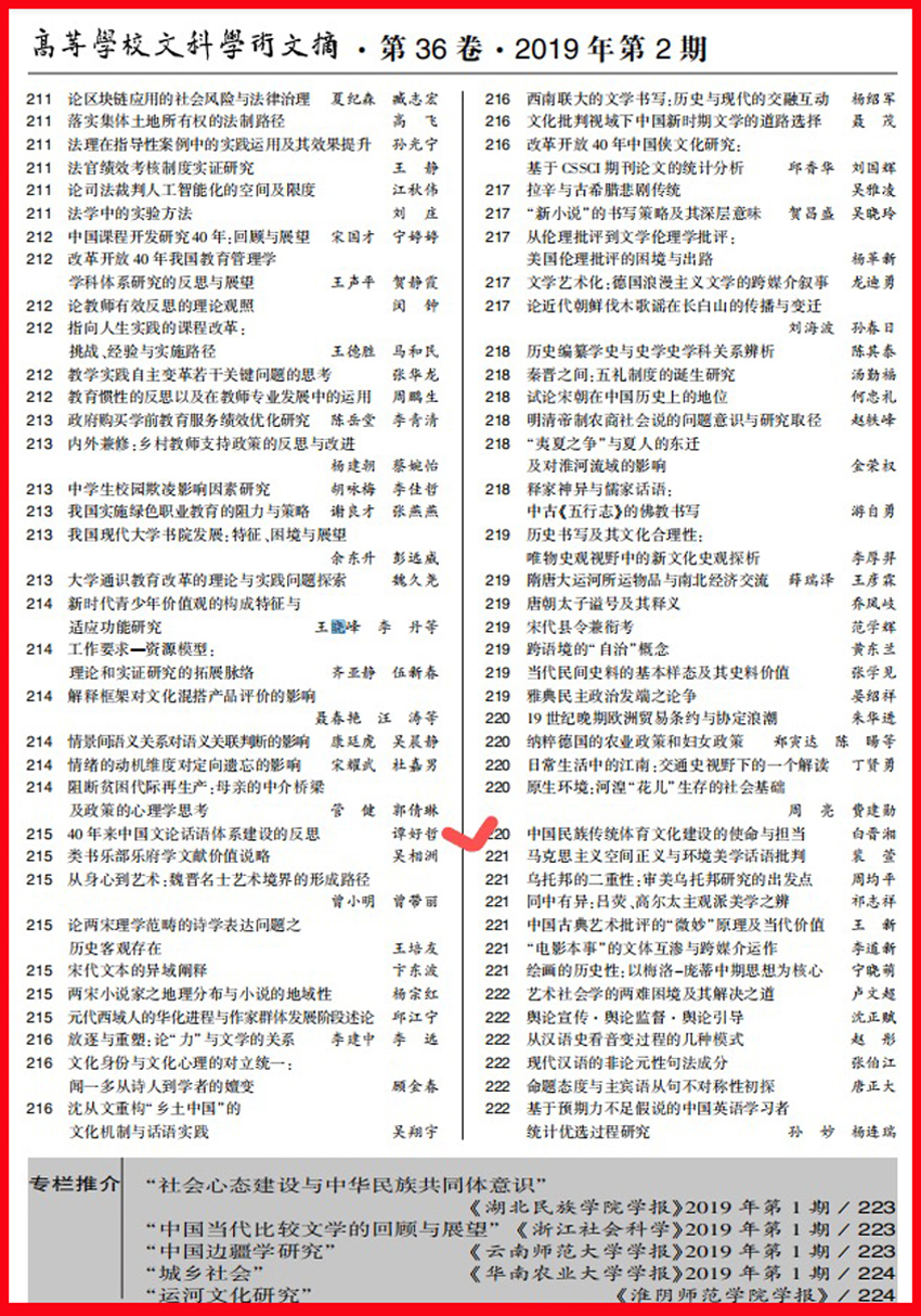《体育学研究》2019年第1期刊发吉首大学白晋湘教授论文《中国民族传统体育文化建设的使命与担当》,被《高等学校文科学术文摘》2019年第2期论点转摘。此次高层次、高水准转载,是PA视讯期刊发展新突破,为期刊高质量发展奠定了良好的开端。