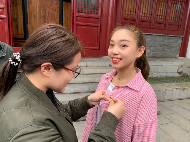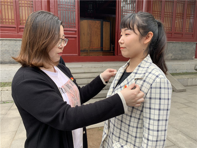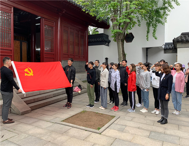 静海寺坐落于南京下关区,是《南京条约》的议约地。它作为全国“百家爱国主义教育示范基地”之一,在经历600年饱尝屈辱与心酸的沧桑历史后,辟建《南京条约》史料陈列馆,重新征集文物资料进行布展,以独具的历史内涵和崭新的风貌巍然于世人眼前,集荣辱于一身。活动伊始,全体人员参观潮音阁,领略当年和平的使者——郑三保之雄风遗烈。经讲解员一番详实介绍后,学员们进一步加深对郑和航海史料的认知,对郑和鞠躬尽瘁、死而后已的精神肃然起敬。出潮音阁后,全体人员还循序参观了《南京条约》史料馆和香港回归厅,在或沉痛或荣耀的近代史中体味到如今国家的繁荣昌盛是多么来之不易,和平安定并非一朝一夕堆砌,学生党员应积极做好模范作用,从党史、国史中自鉴,秉持理论与实践相统一的原则,大力弘扬爱国精神。参观结束后,12名新党员在第二党支部组织委员沈海燕老师的带领下面对鲜艳的党旗庄严宣誓,立下承诺,愿为共产主义事业奋斗终生。随后,辅导员王一迪、程青为新党员佩戴党徽。