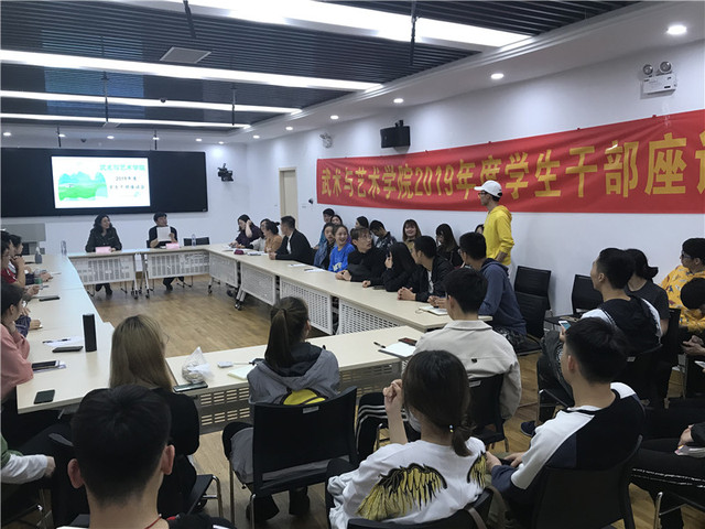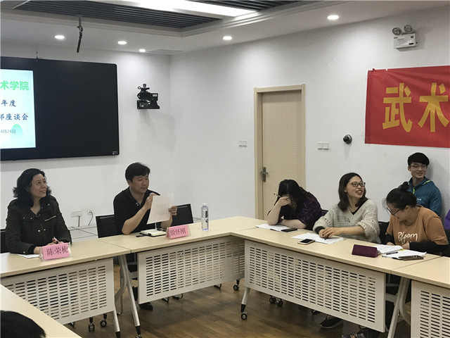 4月24日中午,武术与艺术学院在图书馆第二会议厅召开2019年度学生干部座谈会。武术与艺术学院院长支川、党总支书记殷怀刚、副院长叶瑛、党总支副书记陈荣梅等四位领导出席了会议,院学生会、团总支和各班的学生干部代表参加了会议。本次会议由辅导员王一迪主持。