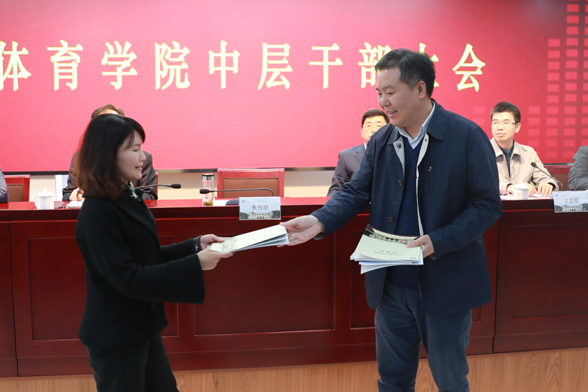 会上,党群部门、高等教育二级学院主要负责同志依次向朱传耿递交了目标任务书,行政部门、竞技体育二级学院主要负责同志依次向杨国庆递交了目标任务书。