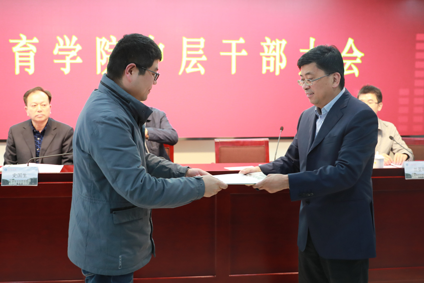 高等教育二级学院主要负责同志依次向校党委书记朱传耿递交目标任务书,图为体育教育与人文学院党总支书记邹国忠递交目标任务书