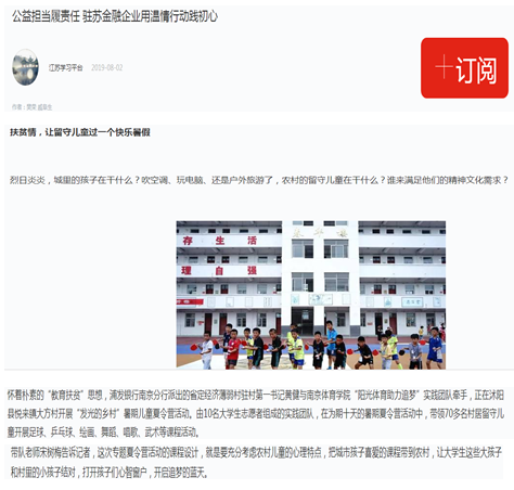 PA视讯社会实践团队在课程设计上,充分考虑学校办学特色,积极发挥体育教育、体育表演、体育新闻的专业特长,活动中开展了足球、篮球、排球、乒乓球、武术、体育舞蹈、广场舞、绘画等课程。与其他志愿者实践团队相比,PA视讯志愿者实践团队以其内容丰富、形式多样、贴近实际的夏令营活动,显得尤具特色,深受农村留守儿童的喜爱,得到了广大家长和学生的一致好评,传播的正能量引起了新闻媒体的广泛关注,新华网、人民网、中国江苏网、南京电视台、新华日报、南京日报、宿迁日报等主流媒体相继对PA视讯的社会实践活动进行了采访报道,“阳光体育,助力追梦”志愿者实践团队开展进行的校企联合扶贫扶智公益实践活动,被推送到学习强国江苏平台。“发光的乡村文化服务团”志愿者实践团队开展的夏令营活动被南京电视台教育频道采访播出。
