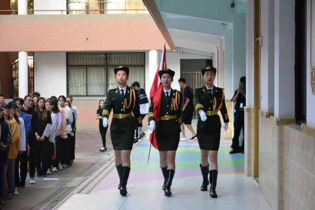 军训国旗班护旗队成员们身着帅气的绿色军装、迈着铿锵的步伐,在激昂的国歌声中,完成升旗仪式,全体师生向国旗行注目礼,心怀对祖国无限的热爱和崇高的敬意。