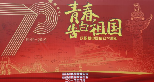2019年9月24日中午12时,运动训练学院于仙林校区田径场举办庆祝建国七十周年“青春告白祖国”主题寄语活动。参加活动的有运动训练学院党总支书记张亚军、运动训练学院党总支副书记杜家俊、辅导员刘宸以及运动训练学院近百名学生。