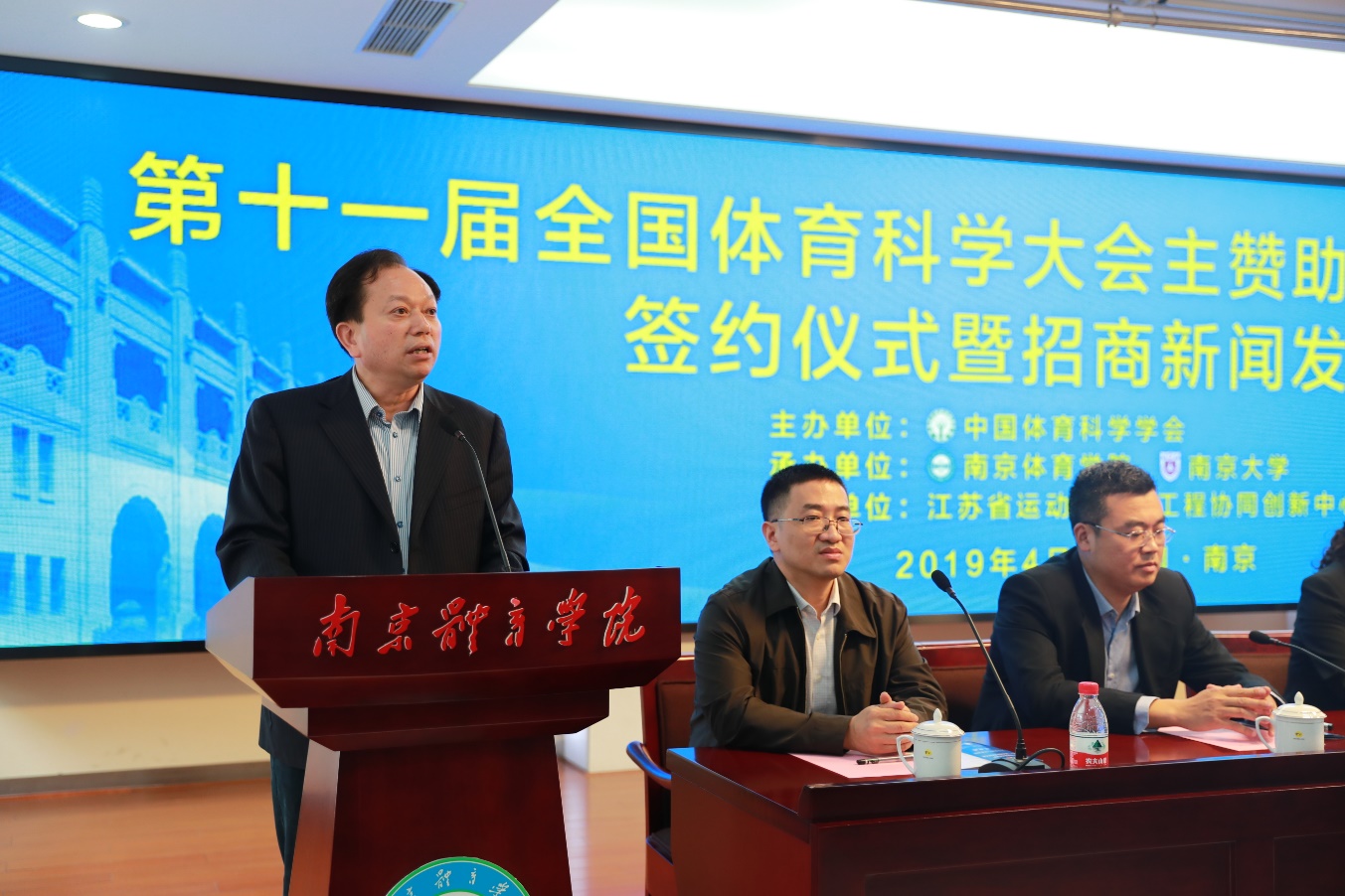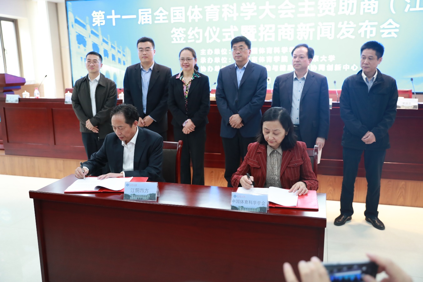 南京春正好,签约逢其时。4月23日上午,第十一届全国体育科学大会主赞助商(江阴四方)签约仪式暨招商新闻发布会在PA视讯101会议室召开。中国体育科学学会副理事长祝莉,PA视讯集团入口校长杨国庆,PA视讯集团入口党委副书记、副校长史国生,PA视讯集团入口副校长李江,江阴四方游泳康复产业股份有限公司董事长史方度,江苏省体育局产业指导中心主任孙金荣,南京大学体育部副主任翟一飞,江阴高新区科技局知识产权科科长崔岩以及全国30多家企业与20多家新闻媒体朋友参加了本次新闻发布会。会议由副书记,副校长史国生主持。