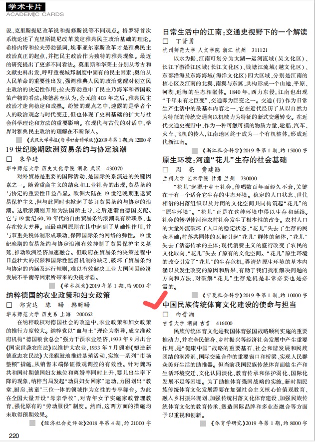 《中国民族传统体育文化建设的使命与担当》学术论点:民族传统体育文化是我国体育强国战略顺利实施的重要推动力,并在全民健身、乡村振兴等经济社会发展中产生重要作用,是“健康中国”战略的重要基石、社会和谐发展和民族团结的润滑剂、国际交流合作的重要窗口和桥梁、实现人民群众美好生活的助推器。 但当前我国民族传统体育面临生产和生活环境变迁、文化认同淡化、教育传承和保护弱化、国际化发展不足等困境。 为了助推体育强国战略的实施,新时期民族传统体育文化发展需要在加强社会主义核心价值观教育、融入乡村振兴规划、加强传统村落文化体育建设、加强民族传统体育文化的教育传承、塑造国际品牌和多业态融合等方面予以重视和创新。(《体育学研究》2019 年第 1 期,约 8000 字)