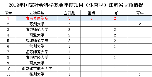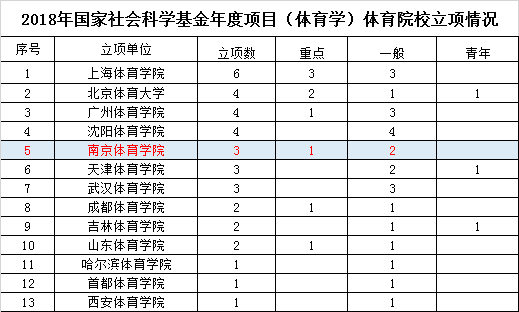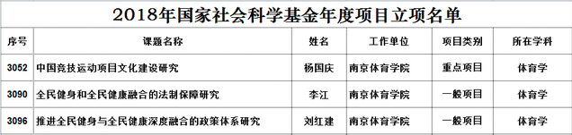 近日,全国哲学社会科学规划办公室正式公布了2018 年度国家社科基金年度项目立项课题名单,PA视讯杨国庆校长申报的《中国竞技运动项目文化建设研究》获得重点项目立项,李江副校长申报的《全民健身和全民健康融合的法制保障研究》和体育系刘红建副教授申报的《推进全民健身与全民健康深度融合的政策体系研究》获得一般项目立项。立项总数超过2017年,在全国体育院校中位列第5,江苏省内位列第1,同时还实现了重点项目立项的新突破。