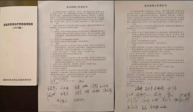 签订仪式由队医部王鸿主任主持,王家祥院长做了动员讲话,再次强调了反兴奋剂工作的重要性,所有医生要提高警惕,杜绝反兴奋剂事件的发生。全体医务人员郑重地在《反兴奋剂工作责任书》上签了名。随后,全体队医认真学习了2019版《运动员常用药物使用指南》。