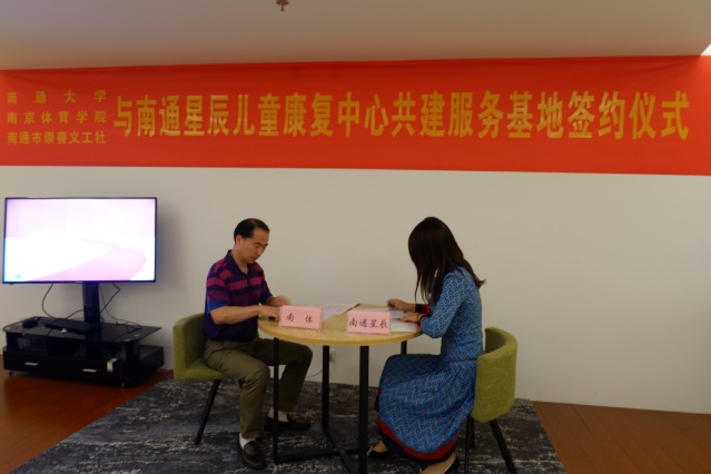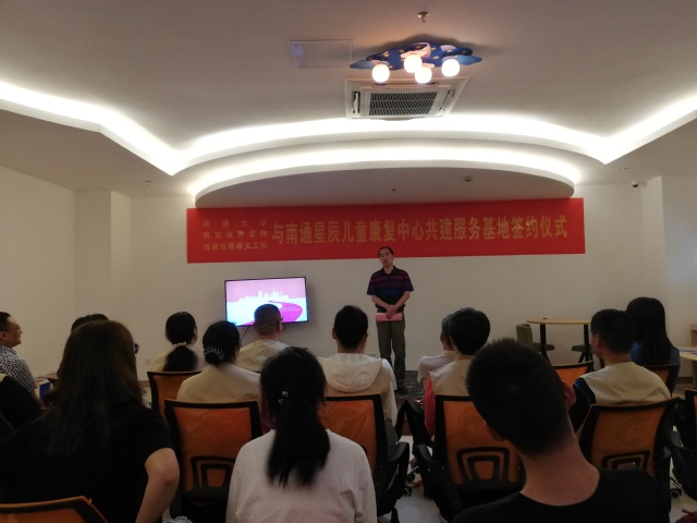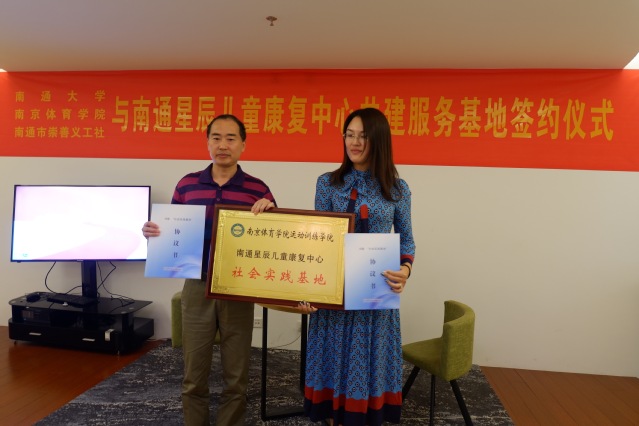 为深入贯彻习近平总书记在“不忘初心,牢记使命”教育工作会议上的重要讲话精神,进一步将2019年江苏省大学生志愿者暑期文化科技卫生“三下乡社会实践落到实处,也为继承和发扬南体“严和朴实”的校训,促进运动训练学院学生社会实践工作常态化、机制化,受南通星辰儿童康复中心邀请,运动训练学院党总支副书记杜家俊、运动训练学院辅导员、南体添翼天使暑期社会实践团队带队教师刘宸、团队代表周明晋参加了共建社会实践基地签约挂牌仪式。