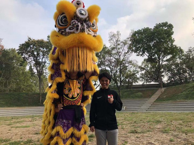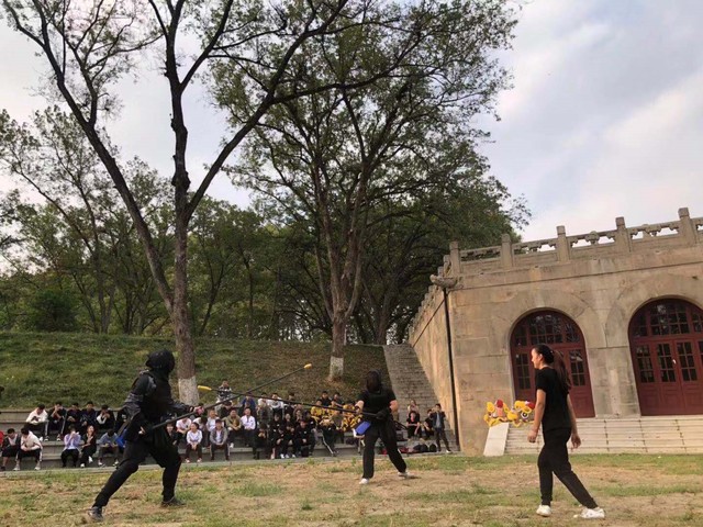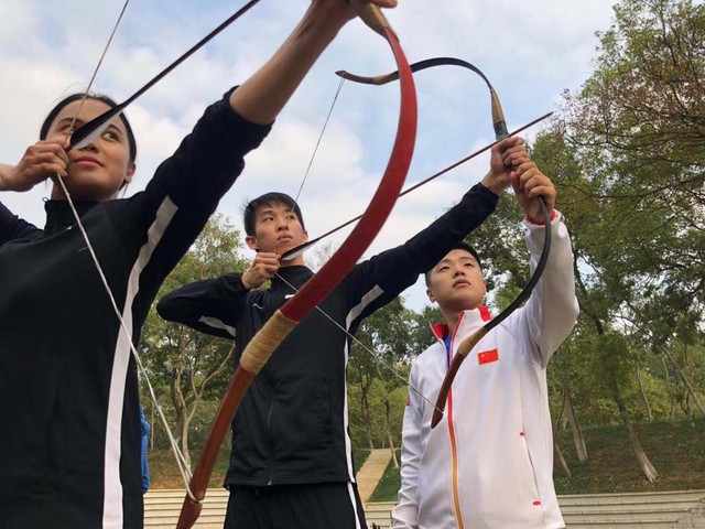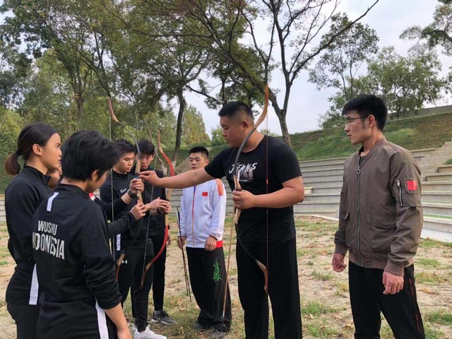 随后,武术与艺术学院同学们展示了舞狮、长短兵、射艺等国术项目。同学们娴熟、高超的技艺得到了大家的阵阵掌声,印度尼西亚国家武术队员也跃跃欲试参加了各国术项目的体验。