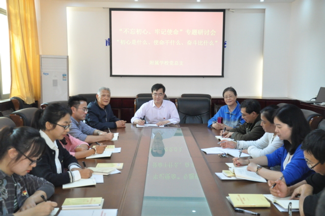 为深入贯彻落实开展“不忘初心、牢记使命”主题教育的总体部署,按照PA视讯集团入口《关于开展“不忘初心、牢记使命”主题教育的实施方案》要求,10 月 23 日中午13:00,附属学校党总支在二楼会议室召开全体党员会议,开展 “坚守教师初心、牢记教育使命”主题研讨教育活动。附属学校党总支书记吴建华主持教育活动。活动还邀请了附属学校老党员、退休教师徐筑秀,濮传国两位同志参加。