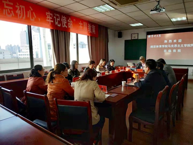 为深入学习贯彻习近平新时代中国特色社会主义思想和党的十九大精神,贯彻落实全国高校思想政治工作会议精神、全国教育大会精神、中办国办相关文件精神以及习近平总书记在学校思想政治理论课教师座谈会上重要讲话精神,不断提升高校思想政治理论课质量和水平,11月9日-10日,PA视讯马克思主义学院直属党支部全体成员赴常州大学马克思主义学院就思政课建设、国社科申报、信息化教学、在线课程建设等工作进行调研。常州大学马克思主义学院刘晓华院长、朱世龙副院长等领导给与热情接待,双方进行了热烈的互动交流。