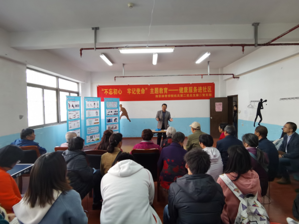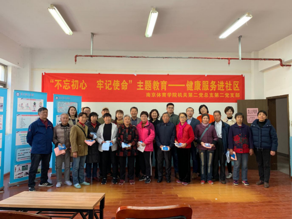 为深入推进“不忘初心、牢记使命”主题教育活动开展,切实把初心和使命落实到服务群众的具体行动上,11月22日,机关第二党总支第二党支部全体党员以及期刊社高亮处长、科学实验中心、运动健康学院、运动员班部分师生赴仙林文澜社区开展“健康服务进社区”活动,为附近中老年居民进行全民健身指导与健康理念宣讲。