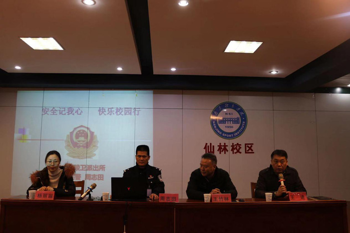 为进一步加强校园防控,增强大学生安全防范意识,12月17日,体育产业与休闲学院特邀孝陵卫派出所周志田警官作大学生安全教育专题讲座,参加讲座的有校保卫处处长、纪委委员王竹林、学院总支书记王进、总支副书记杨丽丽和辅导员沈灵知老师。讲座由学院党总支书记王进主持。