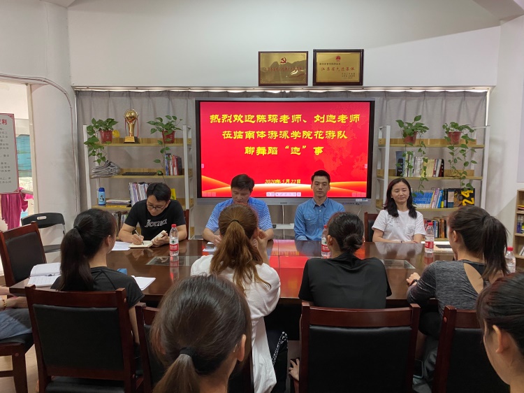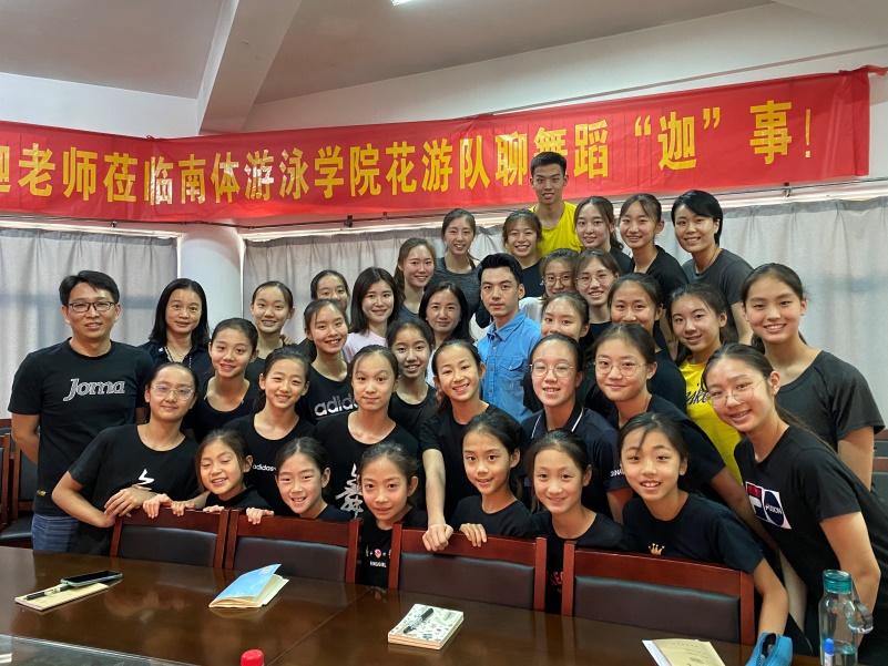花游队历来有观看高水平艺术表演,提高运动员艺术内涵与修养的传统。2020年受新冠肺炎疫情影响,从大年初三开始所有教练员和运动员就一直处在封闭训练状态,为了能够实现艺术表现力持续不断提升,花游队在注重日常舞蹈训练的基础上,及时改变策略,改“走出去”为“请进来”。5月22日下午,国内顶尖青年舞蹈演员南京艺术学院刘迦老师和前线文工团国家一级编导陈琛老师受邀来到游泳学院花游队,与全队来了一次亲密接触。