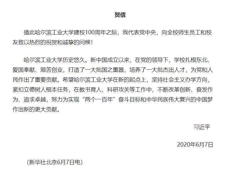 6月7日,中共中央总书记、国家主席、中央军委主席习近平致信祝贺哈尔滨工业大学建校100周年,向全校师生员工和校友致以热烈的祝贺和诚挚的问候。