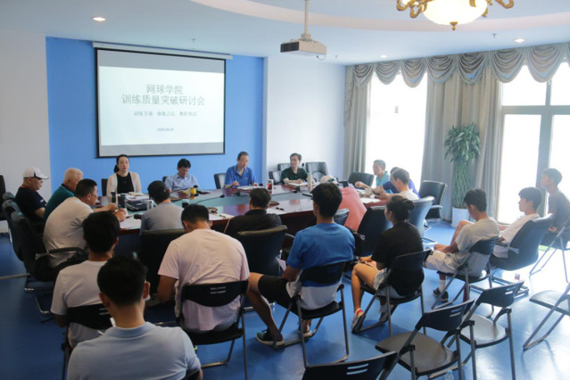 姜惟主持会议并介绍了网球队提升训练质量的举措。随着全国疫情逐步缓解,国内部分赛事重启工作正在逐步推进中,近期将在网球男队A组进行模拟比赛场景训练,增加比赛频次、加大训练强度刺激,从而找到问题短板,做出针对性临赛调整。