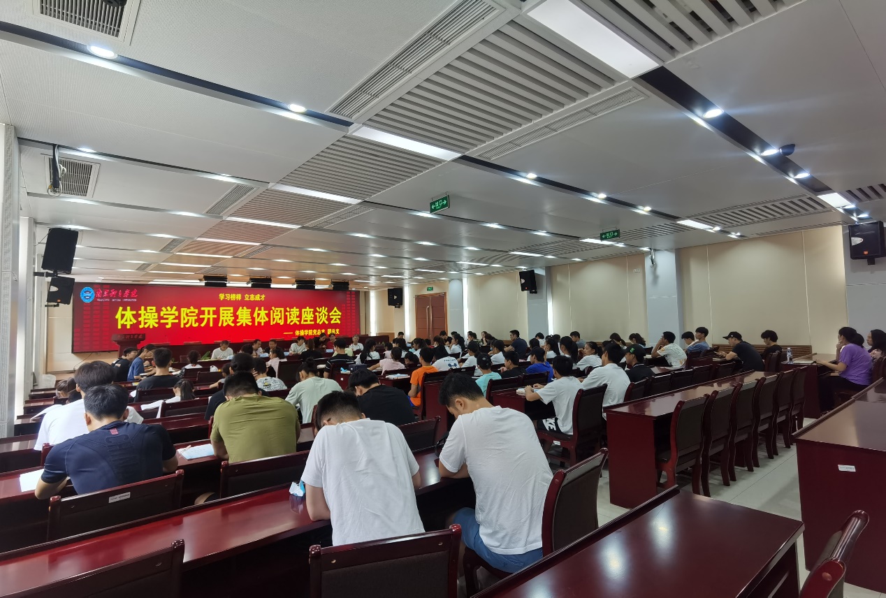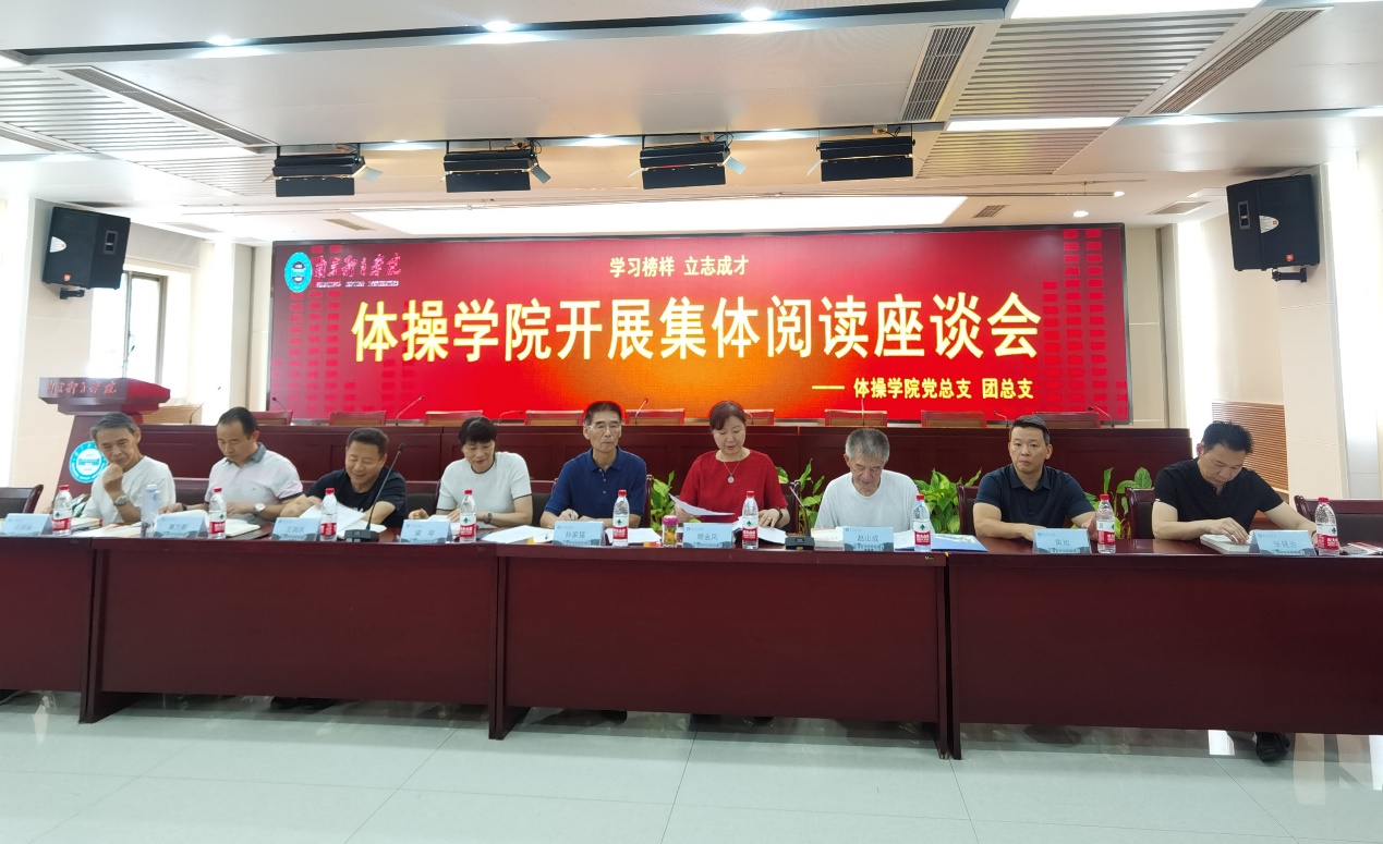 为大力弘扬健康、积极、向上的体育精神,进一步引导青年运动员全面成长成才,8月7日,体操学院在院办101会议室召开一场别开生面的集体阅读座谈会。出席此次会议的领导和嘉宾有体操学院党总支书记、院长梁琴,体操学院党总支副书记顾金凤,体操学院副院长冀方新,国家体操队男子组主教练、江苏省体操队总教练、江苏省体操运动管理中心执行主任王国庆,校关工委秘书长孙家猛,原体操队资深教练尤啓骏,原体操队领队赵山成。体操学院全体管理干部和教练员运动员代表参加此次活动。