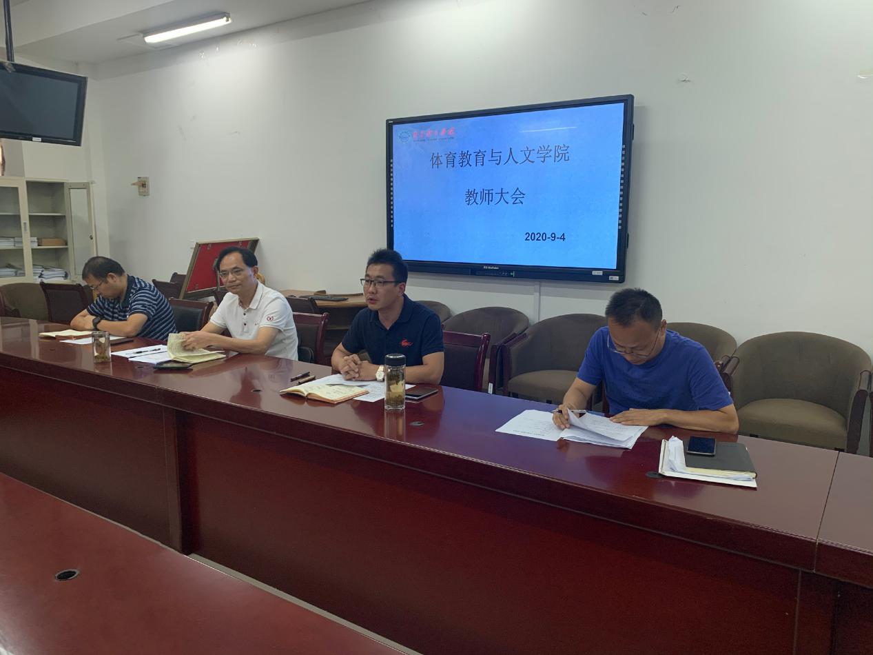 9月4日下午,体育教育与人文学院在115会议室召开教师大会,传达校中层干部会议精神,并部署新学期工作。会议由学院副院长(主持工作)王凯主持。学院党总支书记邹国忠、副院长李金宝、副院长叶强以及全体教师参加了会议。