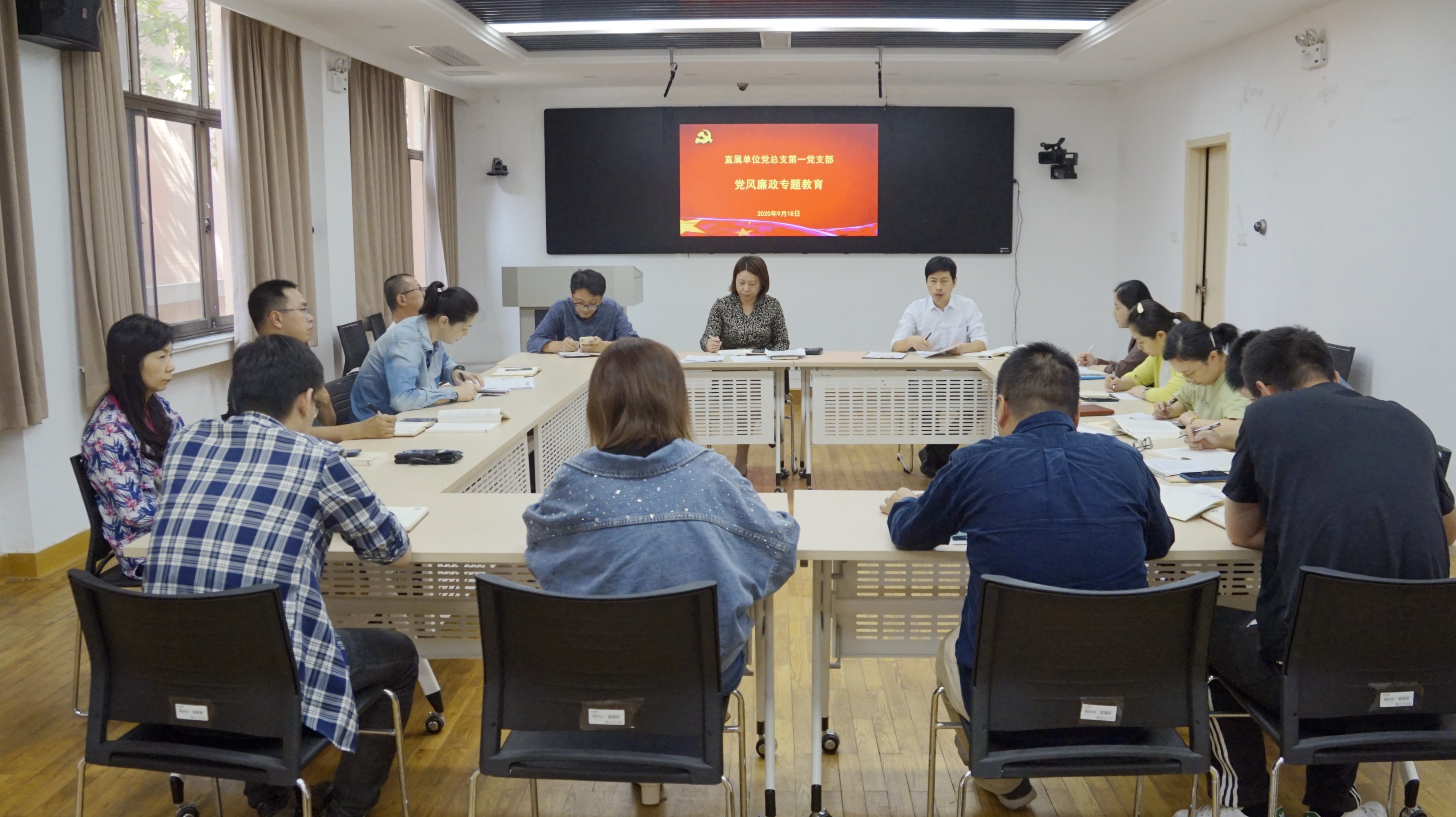 9月18日下午,直属单位党总支第一党支部召党风廉政专题教育会,全体党员干部参加学习,支部书记李明华主持会议。