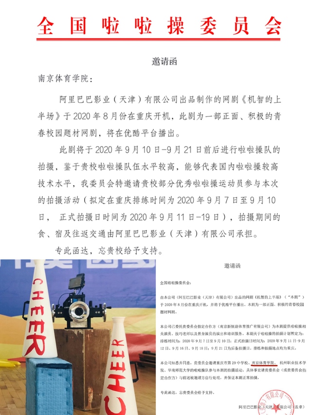《机智的上半场》今年八月在重庆开机,是黎志导演暨《二十不惑》之后,又一部校园青春剧,是以正能量、积极、青春为主题的校园励志网剧,届时会在优酷平台播出。PA视讯大学生生在拍摄中呈现了当代大学生积极向上的青春气息,其高超的技巧表演为啦啦操项目的推广起到了良好的宣传作用,彰显了啦啦操团结、时尚、活力的文化魅力。