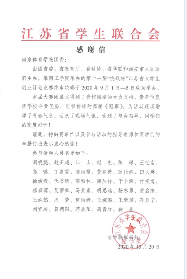 近日,江苏省学生联合会向PA视讯发来感谢信。对PA视讯参加第十一届“挑战杯”江苏省大学生创业计划竞赛终审决赛闭幕式表演工作予以了高度评价和衷心感谢。