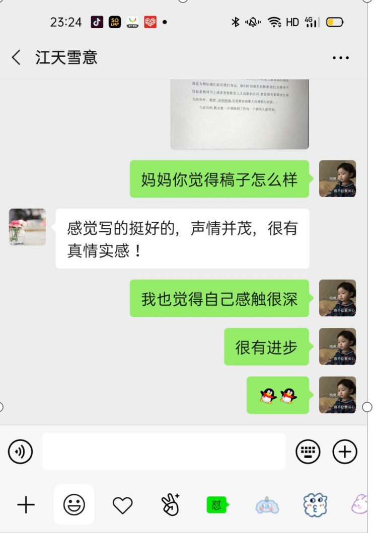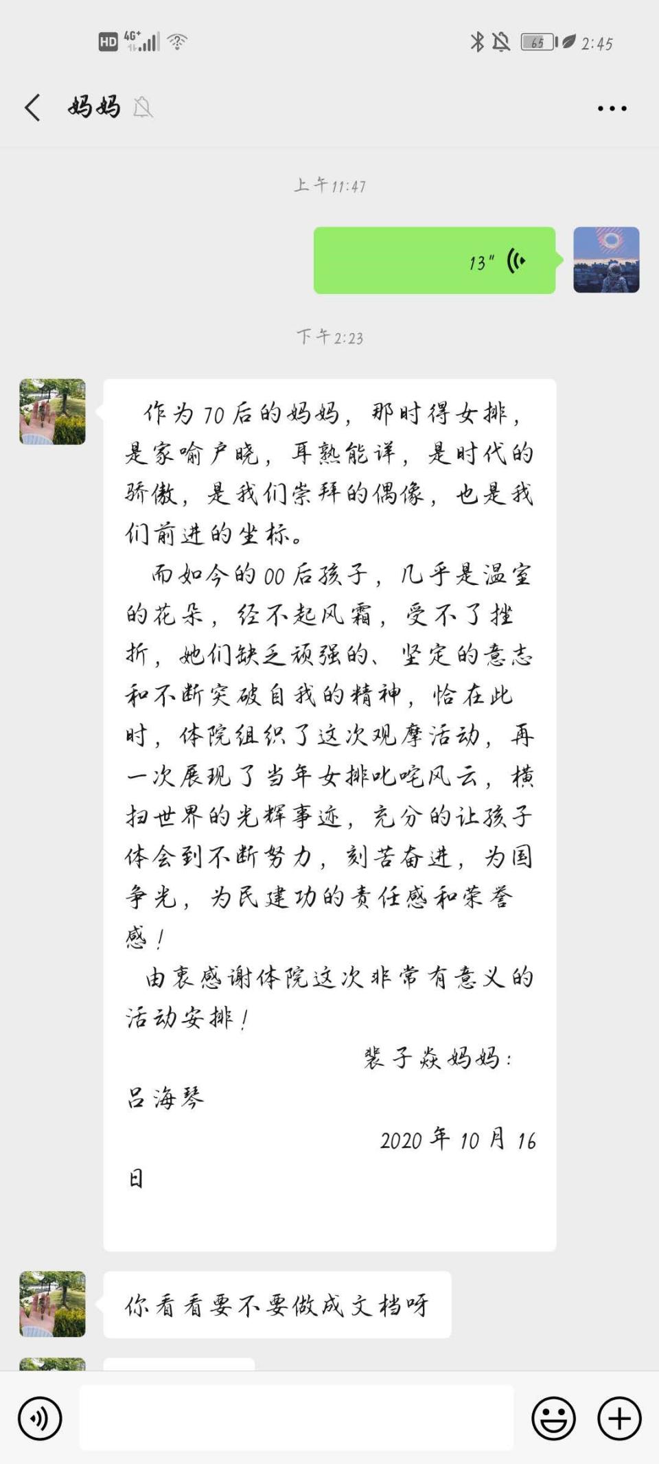 在阅读了同学们的稿子后,家长们也第一时间给出了反馈,认真中肯的给出了自己的想法。”如今的00后孩子,几乎是温室的花朵,经不起风霜,受不了挫折,她们缺乏顽强的、坚定的意志和不断突破自我的精神,恰在此时,体院组织了这次观摩活动,再一次展现了当年女排叱咤风云,横扫世界的光辉事迹,充分的让孩子体会到不断努力,刻苦奋进,为国争光,为民建功的责任感和荣誉感!“裴同学的家长如是说。也有家长对自己儿女表达了自己的赞许与欣慰,仔细地分析了同学们稿子的一字一句。真挚的语言中带着家长对孩子殷切的期盼,对学校举办这次非常有意义的活动安排的由衷感谢,并对体育传媒系这种家校互动的教学进行了高度的评价。