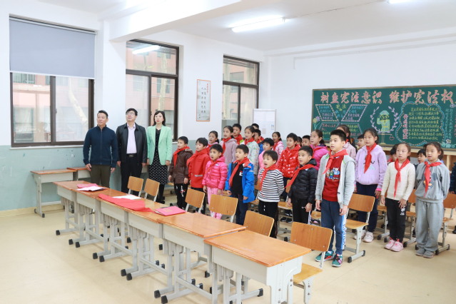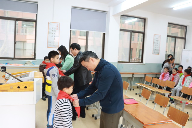 黄旭、阚妮妮、吴建华三位老师为新入队的少先队员配戴红领巾