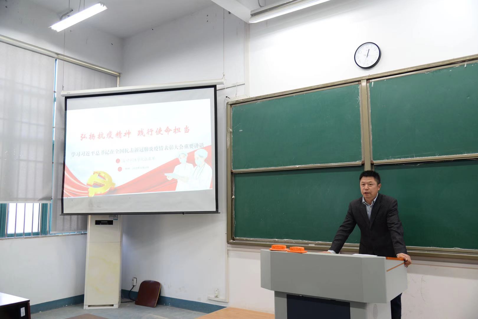 中共中央宣传部、教育部联合印发通知对结合开学入学教育开展抗疫精神宣传作出部署。为进一步落实通知精神,深入宣传伟大抗疫精神,教育引导广大团员青年增强“四个意识”、坚定“四个自信”、做到“两个维护”,进一步坚定对中国共产党的拥护和信赖,进一步增强对中国特色社会主义的信心,进一步增强民族自信心和自豪感。2020年11月13日中午,学院开展了“弘扬抗疫精神、践行使命担当”专题讲座,学院第六期“青马工程”培训班全体学员聆听讲座。讲座由学院党总支书记张亚军主讲。