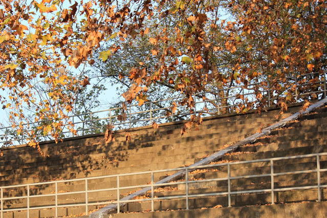 结束了网院的学习与拍摄后,同学们来到了中央体育场、国术场等民国体育建筑群。中央体育场建成时曾是远东地区最大的体育场,如今几十年沧桑巨变,古老的建筑历经风雨洗礼,依旧沉稳而大气,见证着国民体育素质的提升和一座城市的发展前进。中国式的屋檐与罗马拱门立柱相映成趣,加上大门前立着的两个青铜鼎,尽显端庄巍峨。体育场上方的看台,沧桑而班驳,与枯黄的树叶相映,更显时代的印记。同学们漫步其中,举起相机定格秋日限定的中央体育场,在美的感受中体悟时代的变迁与这片土地上不朽的体育精神。
