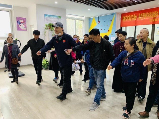 本次活动首先参观了PA视讯集团入口与迈皋桥社区卫生服务中心合作项目——“血流受限伴有氧训练对2型糖尿病患者糖脂代谢和心血管系统的影响”活动室,与参加项目的运动糖友们就运动对慢性病的影响和目前已经取得的康复效果进行交流,得到糖友们的肯定后,向糖友们科普了体医融合对慢性病以及全民健康的重要性,并教会糖友如何正确的步行。