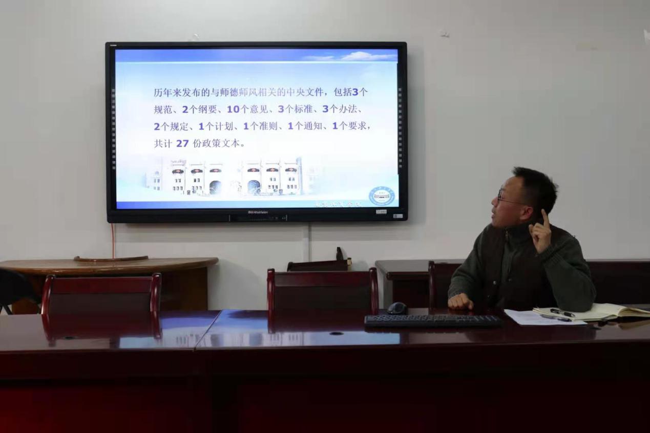12月15日下午,为进一步贯彻党的教育方针,推进师德师风建设活动的深入开展,体育教育与人文学院于115会议室召开师德师风教育专题培训。体育教育与人文学院党总支书记邹国忠,体育教育与人文学院副院长(主持工作)王凯,体育教育与人文学院副院长李金宝,体育教育与人文学院副院长叶强以及体育教育与人文学院全体教师参加会议。李金宝为全体教师做了改革开放以来我国师德师风的政策演进、特征的专题讲座。