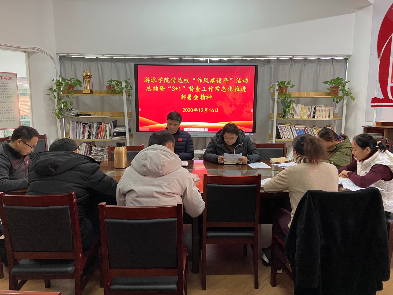 12月16日上午,游泳学院全体管理干部在跳水花游馆二楼会议室召开会议,专题传达学习“作风建设年”活动总结暨“3+1”督查工作常态化推进部署会精神。会议由游泳学院党总支书记、院长王伟新主持。
