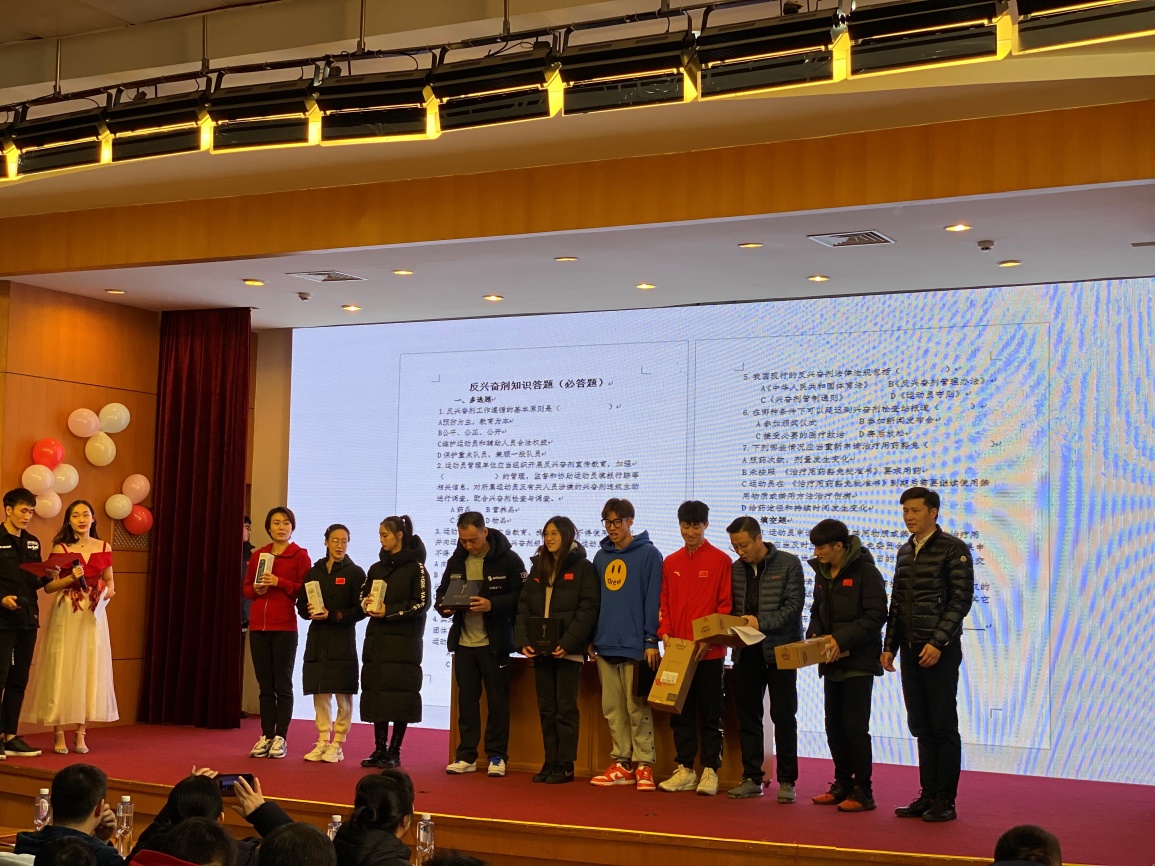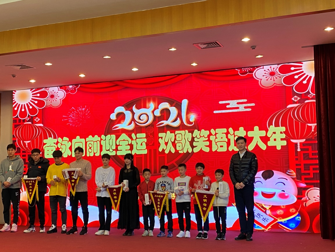 游泳学院运动员踊跃报名参加节目编排演出,全体管理干部、教练员积极参与到活动的组织中。联欢活动节目内容丰富多样、精彩纷呈,有舞蹈串烧、RAP独唱、诗歌朗诵、手语舞蹈等共计9个节目。在节目中间穿插进行了幸运大抽奖和反兴奋剂知识竞赛答题活动。反兴奋剂知识竞答环节设有3种题型,分别是必答题、抢答题和难度题。每支运动队分别派出3支代表队参加反兴奋剂知识竞答,参赛者们兴致勃勃、不甘落后,反兴奋剂答题活动既紧张激烈、充满欢声笑语,又进一步学习了反兴奋剂的相关知识。联欢活动让全体干部职工、运动员在训练、备战之余感受到了浓浓的节日氛围,充分展示了游泳学院积极向上、团结奋进的精神风貌。活动最后,游泳学院党总支书记、院长王伟新给第七期“文明卫生宿舍”获奖者颁奖,在校“文明卫生宿舍”(第七期)评比中,游泳学院共5个宿舍获得“文明卫生宿舍”称号。