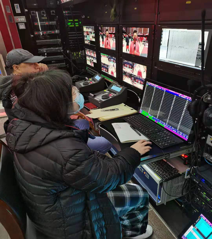 浙江诸暨市暨阳学院体育场的5号门口,在江苏省广播电视总台的转播车上,一支由南体学子组成的赛事转播团队,正在协助省台体育休闲频道的专业技术人员,进行着2020-2021赛季CBA常规赛第三阶段的转播。“12号机同学,麻烦你拉一个全场。”演播室的赵导播在麦克风里喊着的,正是大一新闻专业的学生朱永康,他负责场上12号机位的拍摄。与此同时,转播车上负责光圈的大四实习生杜伟、张淑婷,正在小心翼翼的控制着手上的摇把,将场上摄像机转播的画面调到最佳;负责FX设备的汤歧雯、张蕊、林慧同学,也在全神贯注的操作着设备,力图将最精彩的场上动作和进球瞬间展现在球迷眼前。每一个实习生都在默默做着自己的工作,为CBA篮球赛事转播贡献力量。