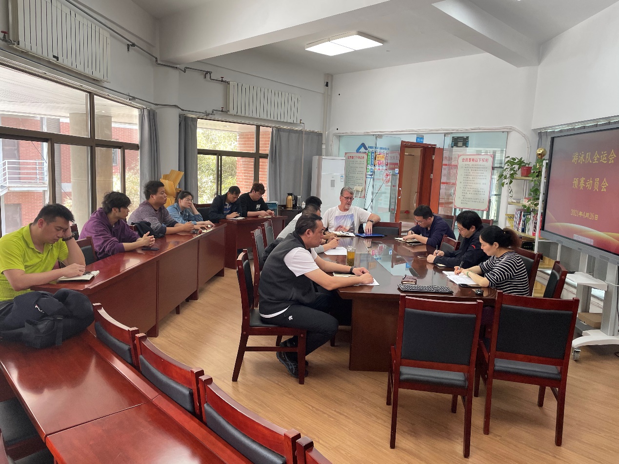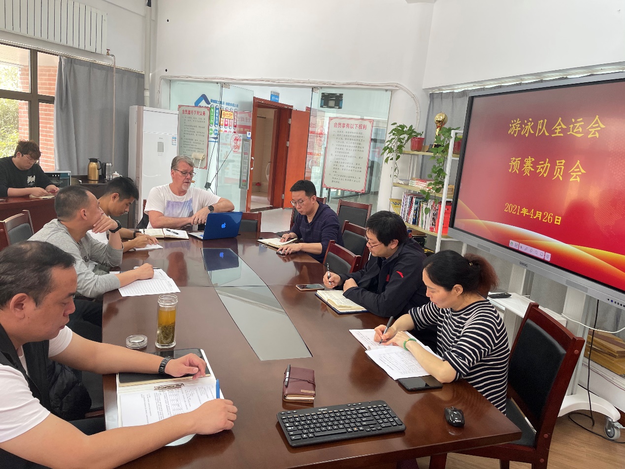 4月26日,游泳学院游泳队在跳水花游馆二楼会议室召开2021年全国游泳冠军赛暨第十四全运会预赛比赛预案过堂会,训练处副处长叶蓁、游泳学院党总支副书记陈志出席了会议,游泳队全体教职工和游泳队队医参加了过堂会。