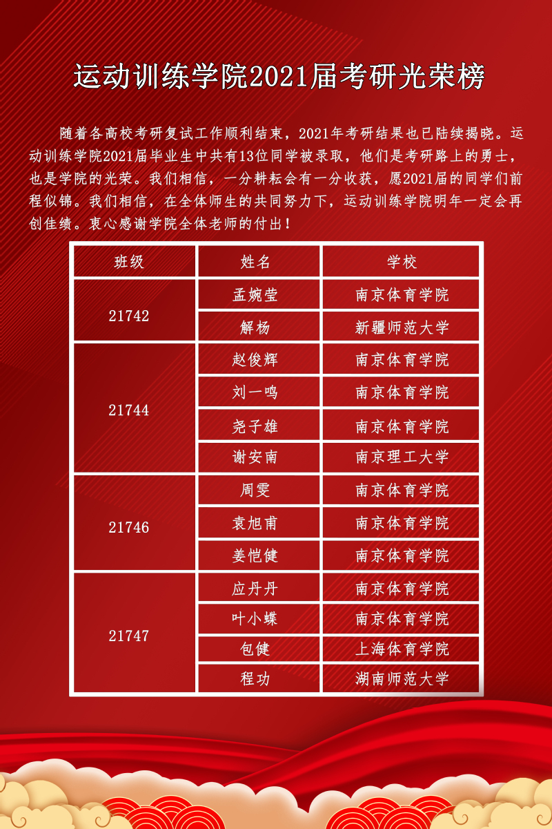 2021年运动训练学院2021届学生共有13名同学被国内高校录取,继续深造。既然选择了远方,便只顾风雨兼程。考研之路注定艰难,运动训练学院2021届学子们披荆斩棘,克服种种困难成功上岸!临近毕业,他们对学校、对学弟学妹也有很多想说的话。