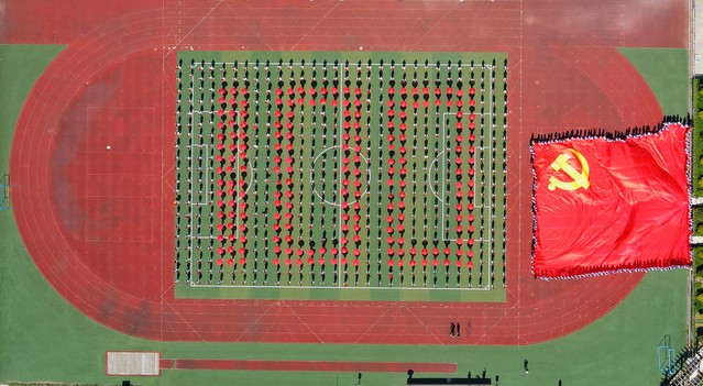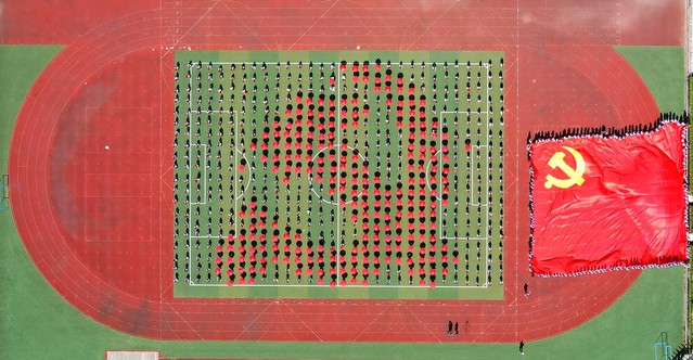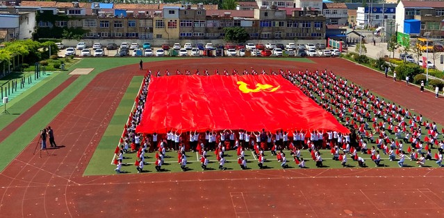 近千名小学生和PA视讯师生一起,大手拉小手共绣党旗。主席台上高校和小学代表手工绣党旗,台下操场上近千名小学生在技巧世界冠军赵杰老师的指导下,利用团体操队形变换出各式各样的图案,并拼出“中国、1921、2021、100”和党徽等图案,台上台下交相呼应共绣党旗,最后一面巨幅鲜红的党旗从学生们头顶飘过,象征着小学生们在党的关怀下茁壮成长。